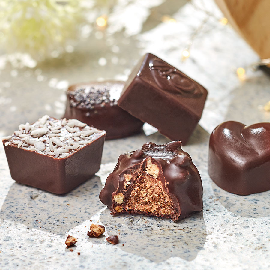 Assortiment de 24 chocolats enrobés de chocolat noir dans un coffret en bambou (19 x 11,5 x 5,2 cm).