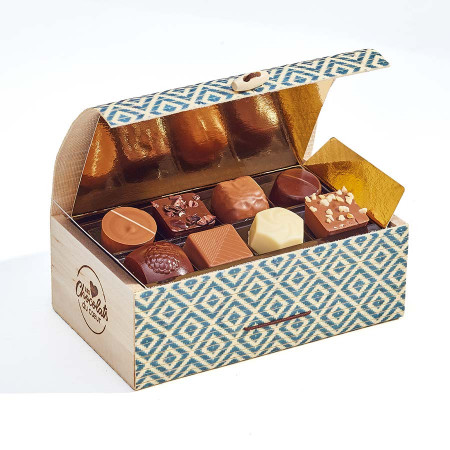 Assortiment de 16 chocolats avec édulcorant dans un coffret en bambou (15,6 x 9,5 x 5,7 cm).