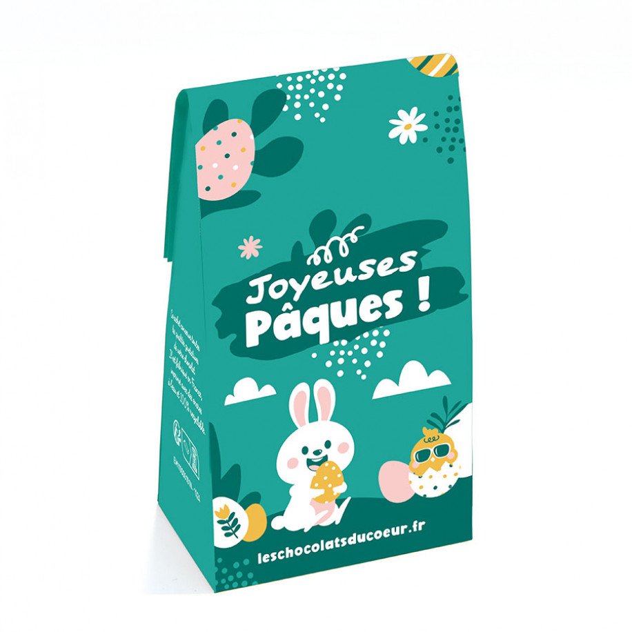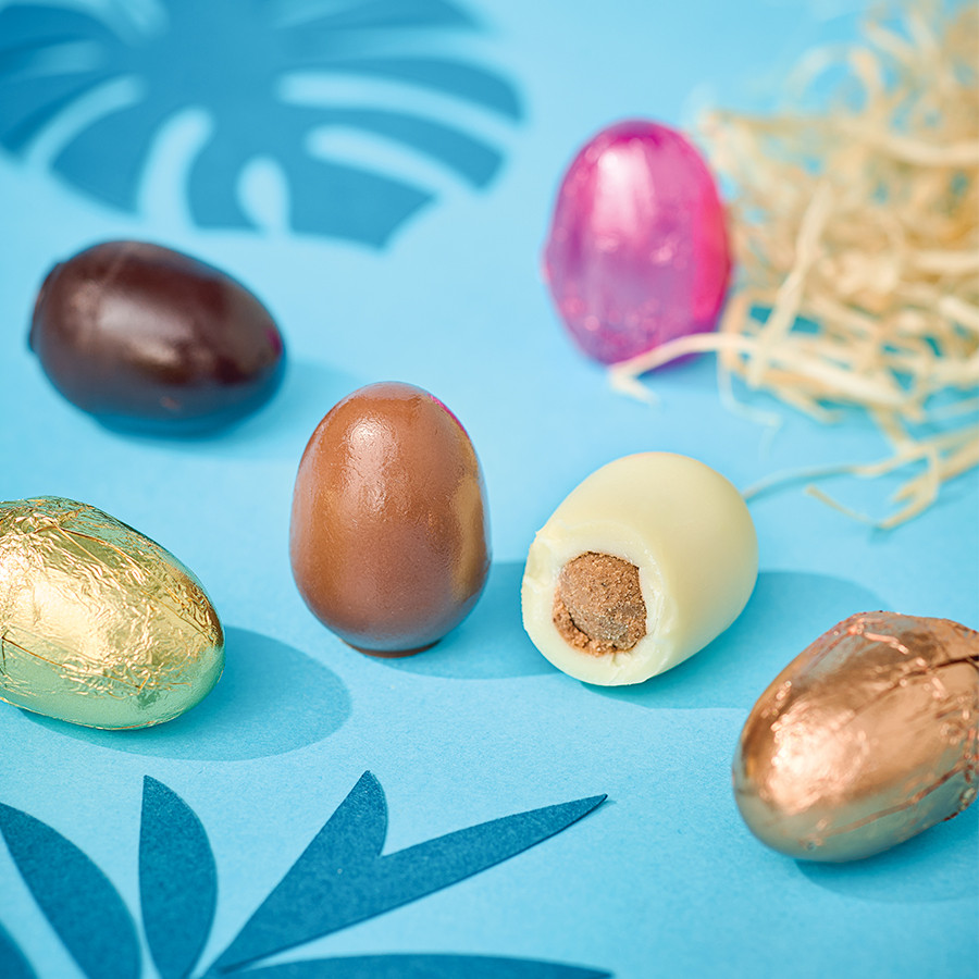 130 g d'oeufs (environ 17 pièces) au praliné enrobé de chocolats noir, au lait et blanc. Livrés dans un sachet décoré.
