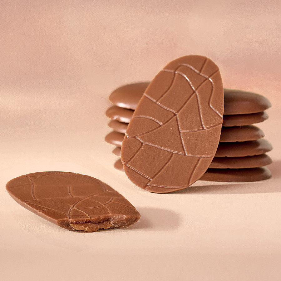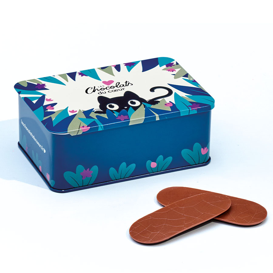 Fines lamelles de chocolat au lait fourrées d'une ganache au caramel et à la fleur de sel de Guérande (environ 32 pièces). Livrées dans une boîte en métal (11,9 x 8 x 4,8 cm).