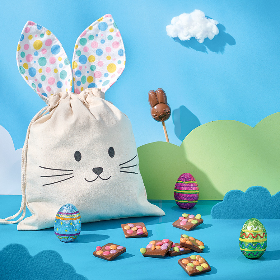 Ce joli pochon en tissu (60% coton, 40% polyester, 22x30 cm) avec lien coulissant et oreilles de lapin contient :