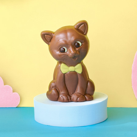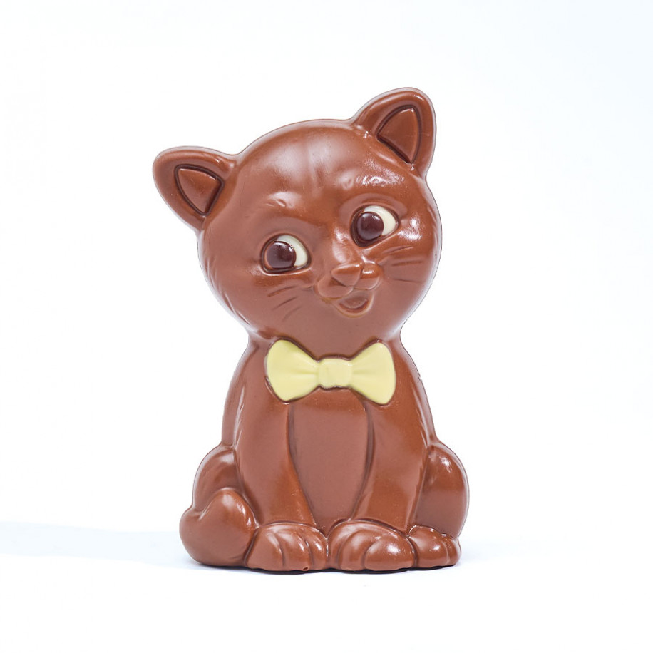 Moulage de 70 g au chocolat au lait décoré aux chocolats noir, blanc et coloré jaune (H. 11 cm). Livré dans un sachet kraft décoré.