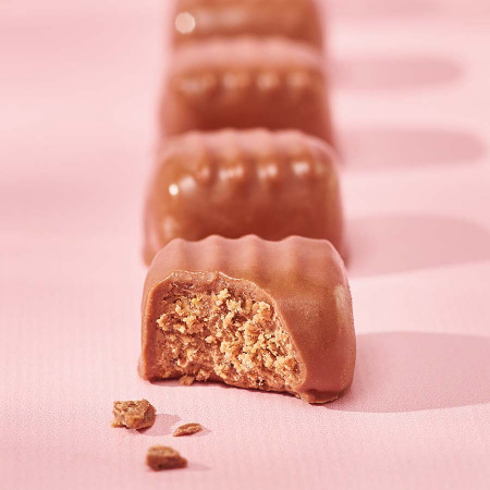 16 pralinés feuilletés amandes et noisettes avec des brisures de crêpes croustillantes, le tout enrobé de chocolat au lait. Livrés dans leur coffret en bambou (15,6 x 9,5 x 5,7 cm).