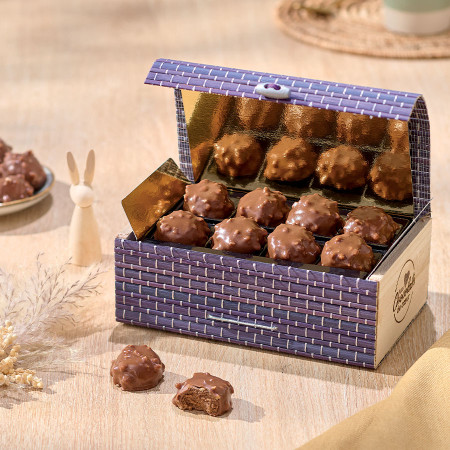 16 rochers équitables au fourrage praliné amandes et noisettes avec grains de noisettes caramélisées enrobés de chocolat au lait dans leur coffret en bambou (15,6 x 9,5 x 5,7 cm).