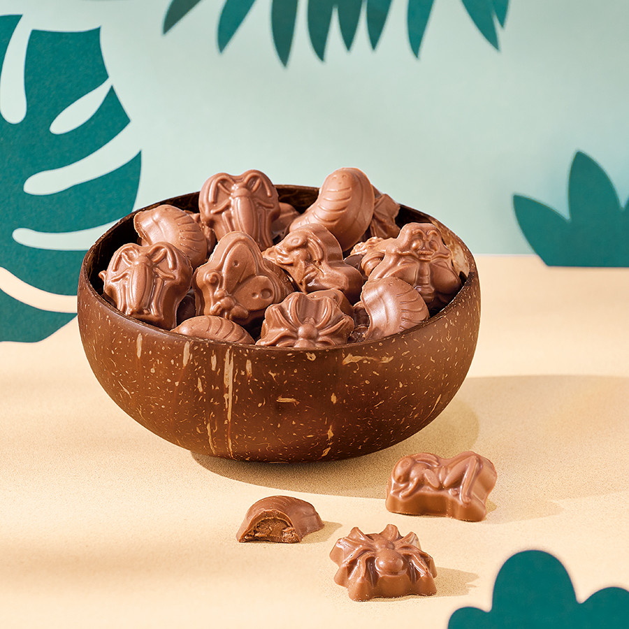 Fritures fourrées au praliné en forme d'insectes (grillons, sauterelles, araignées...) enrobées de chocolat au lait, dans un bol en noix de coco (diam. 12/14 cm). Livré dans un sachet kraft décoré.