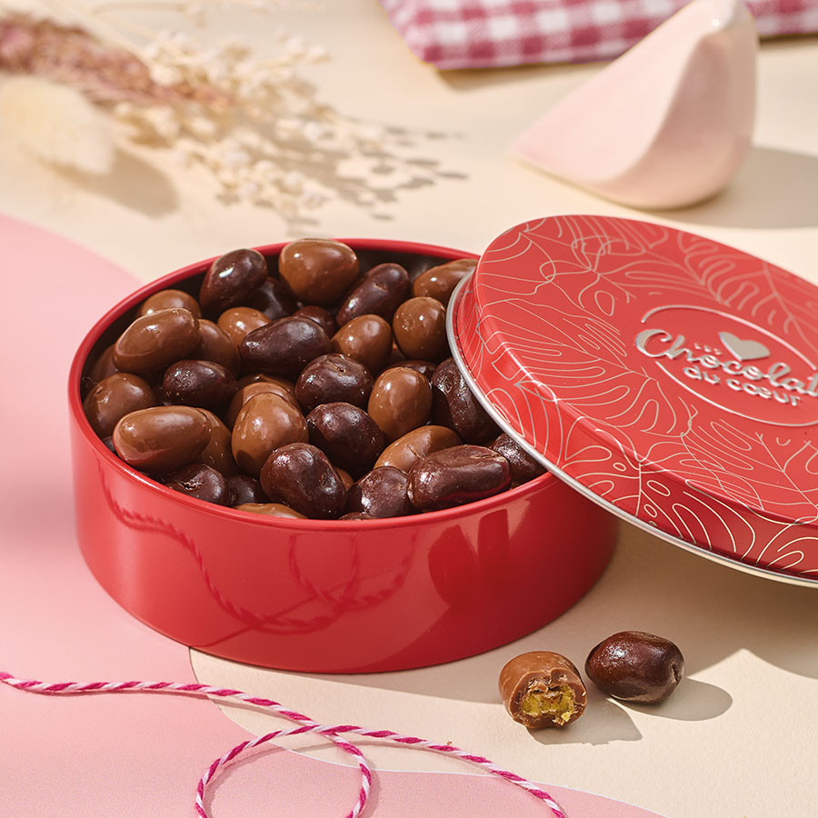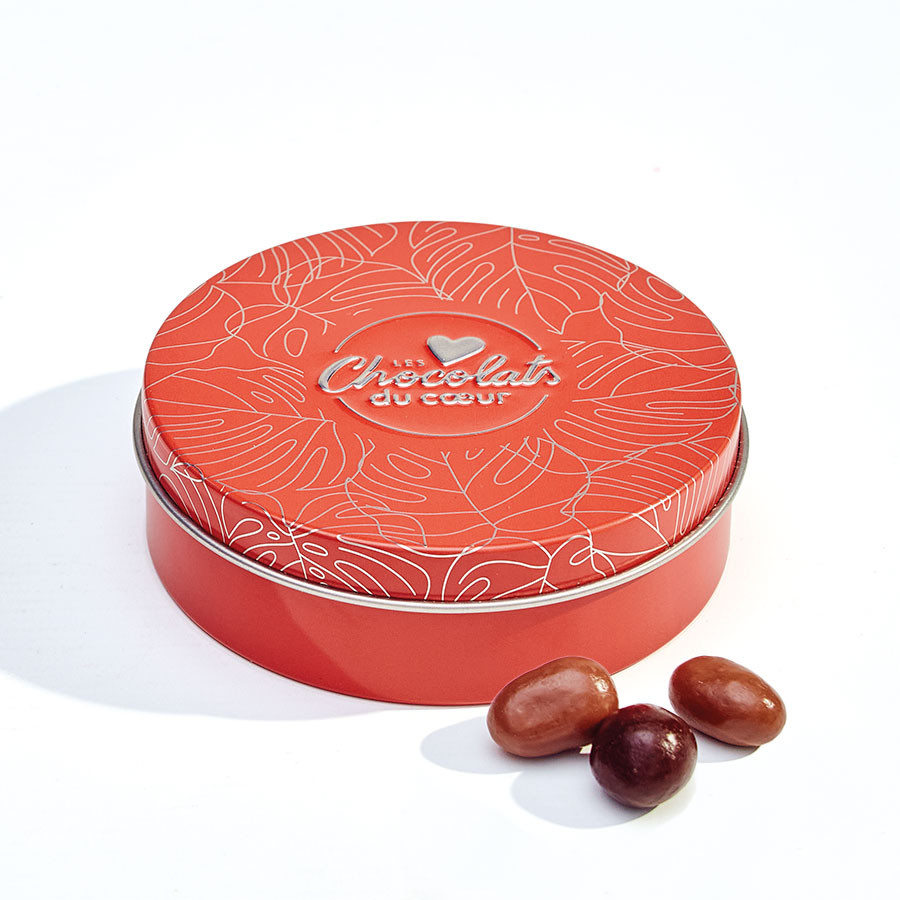 Grains de maïs au miel enrobés de chocolat au lait et grains de maïs salés enrobés de chocolat noir dans leur boîte en métal (9,6 x 3 cm). Livrée dans un pochon en organza.