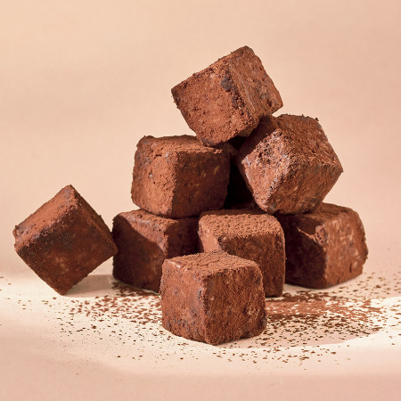 36 petits cubes de praliné amandes et noix de macadamia poudrés de cacao dans une boîte en métal (10,8 x 10,8 x 2 cm). Livrés avec 2 pics en bambou dans un pochon en organza.