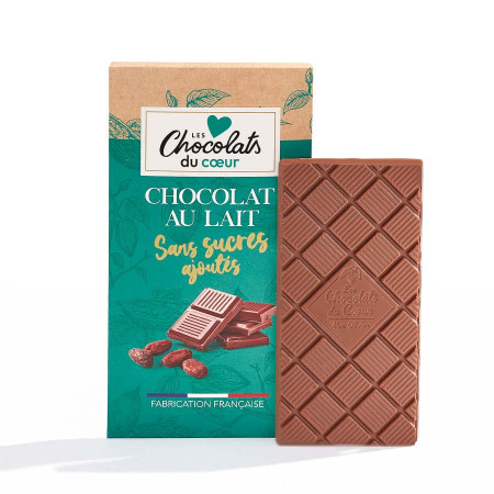 Tablette au chocolat au lait sans sucres ajoutés, avec édulcorant. Livrée dans un étui cartonné (19 x 10 cm).
